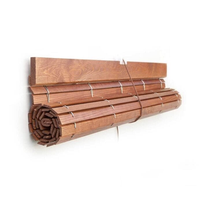 La mayoría de este tipo de persianas de madera están fabricadas con madera de pino, por lo que son de una elevada calidad. Las hay de diferentes acabados: natural, pintado o barnizado. Suelen subirse o bajarse a través de una correa y están atadas al hueco de la ventana (bien sujetas por el viento).